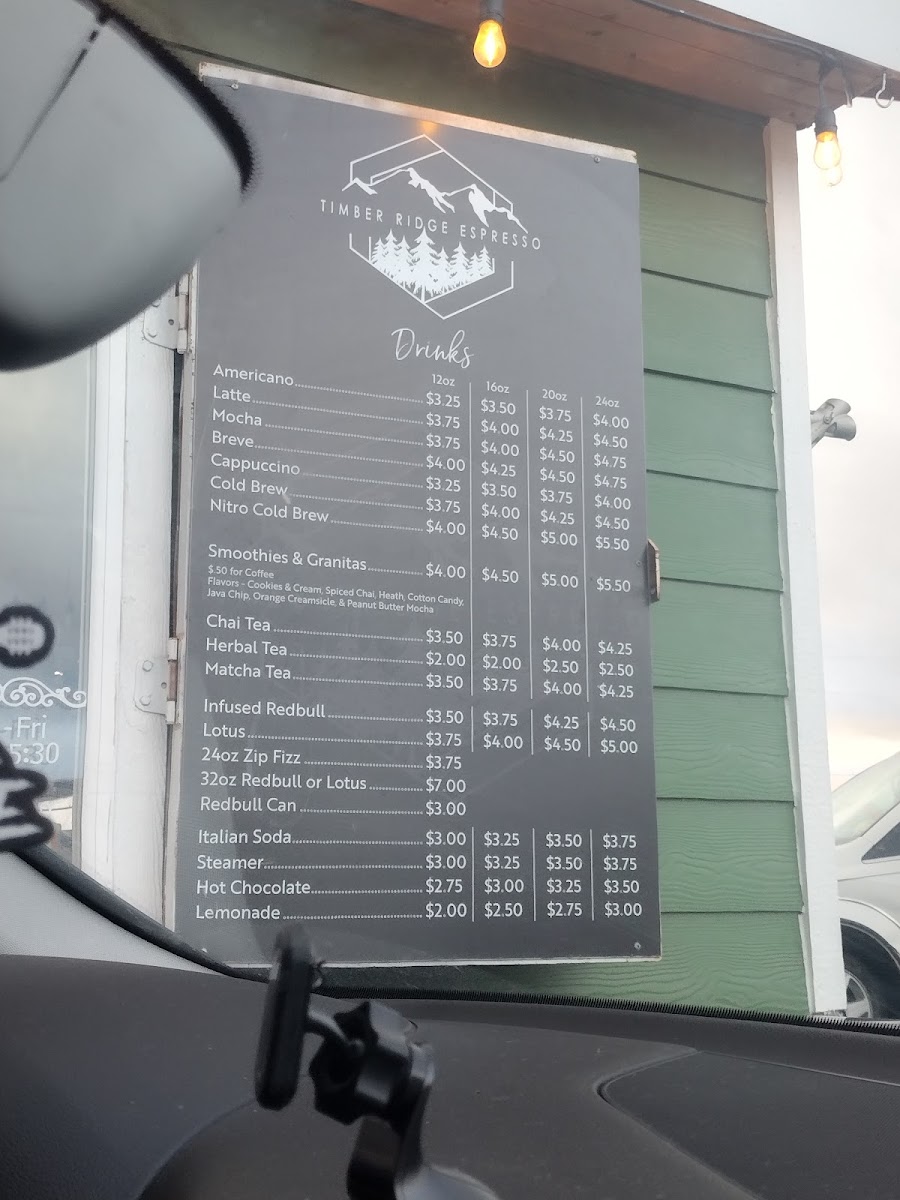 If you're in the mood for something a little different, they also offer Chai Tea, Herbal Tea, and the energizing Matcha Tea. For a bold boost, you can opt for an Infused Redbull or a 32oz Redbull or Lotus. Whether you're stopping by for a quick pick-me-up or a leisurely treat, Timber Ridge Espresso has something for everyone!